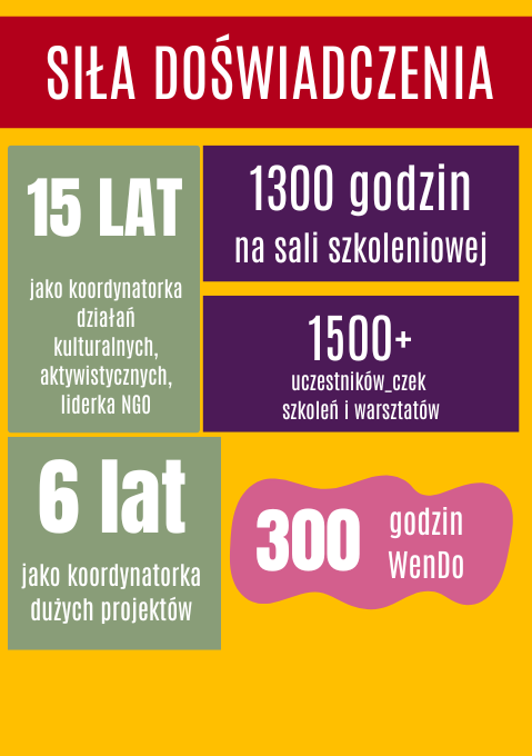 Od lat realizuję projekty społeczne, kulturalne i teatralne. Wyszkoliłam ponad 1500 osób. Pracowałam jako facylitatotka w instytucjach kultury, firmach i grupach oddolnych oraz jako koordynatorka dużych projektów grantowych, w tym unijnych i w ramach Funduszy Norweskich w organizacjach pozarządowych.